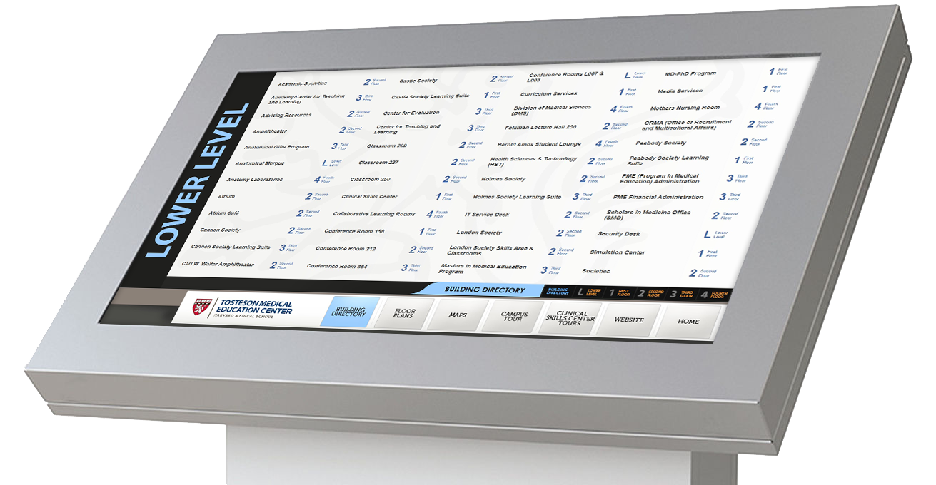 With a student population of over 1600, Harvard Medical School sought an interactive digital signage system that would showcase the curriculum and services that they offer, as well as provide vital information about student services, alert the campus community to important bulletins, and provide directions to help those unfamiliar with the Medical School Building find their way around.