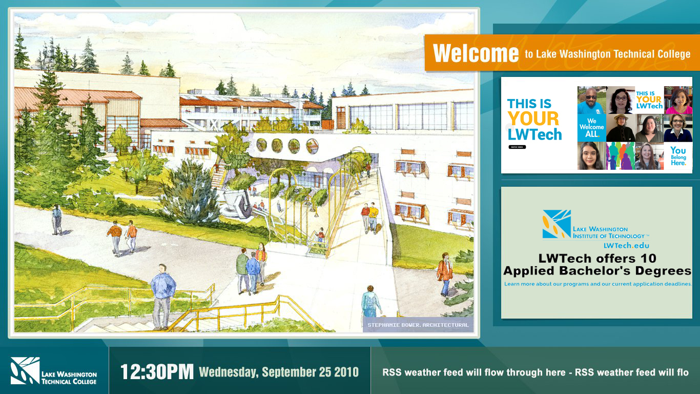 Lake Washington Technical College, an institute located in Washington state’s high tech corridor that serves over 5000 students every year, came to ConnectedSign to seek assistance with their digital signage needs. They were looking for a system they could use for emergency communications, event and services promotion, and an outlet to share student and visitor information. Another item on their list of needs was the ability to distribute content from third-party suppliers, such as weather or broadcast television.