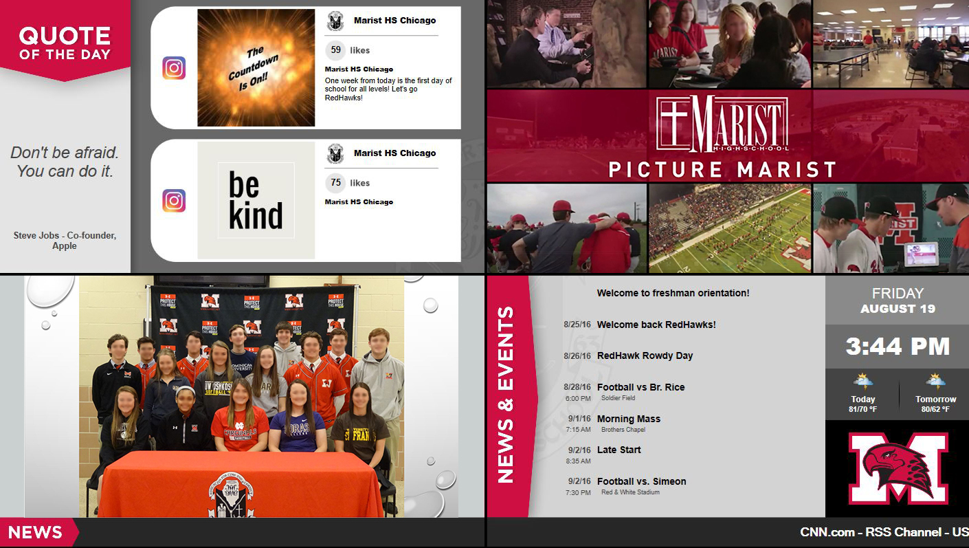 We worked with Marist High School to create a robust active video wall with dedicated spaces for news and events, videos and photos as well as social media adapters. We created a main screen that is branded with Marist’s logo and colors. This main template consists of a rotating quote of the day as well as Twitter and Instagram social media sections that rotate current posts. The opposite sections of the video wall showcase PowerPoint slide shows and video highlights. In the bottom right hand corner, school news and events populate based on schedules. Weather, time and date are also featured. We included a ticker of world events to keep students and faculty informed of current events. This main template alternates with a full screen template that can play video, images or PowerPoints.