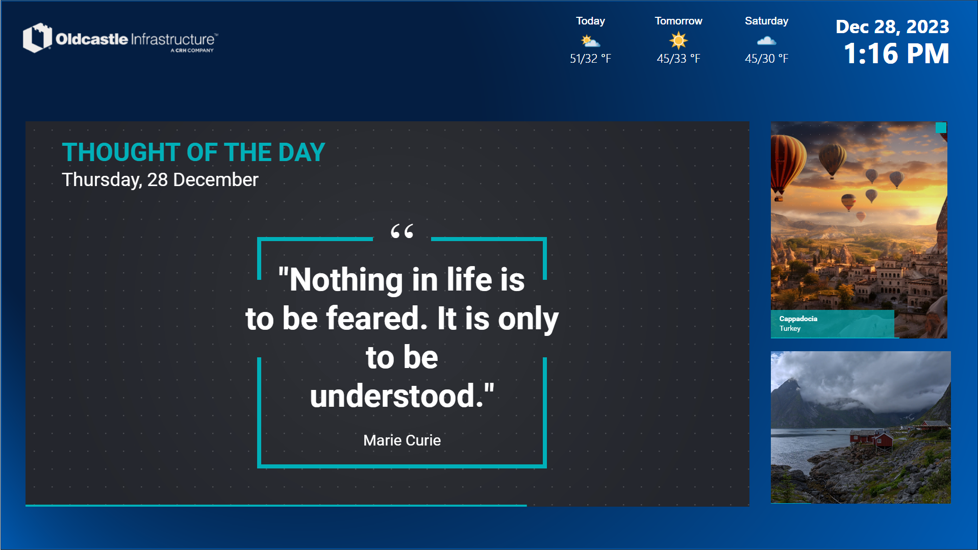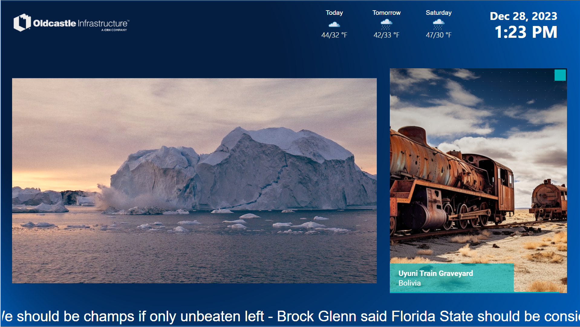 Oldcastle Infrastructure embarked on a 2023 update, adding 22 pilot locations with new digital signage. These 22 locations consist of offices, warehouses, and customer areas. The primary goal was to implement a system that offers easy management, quick adaptability, and customization for all 22 sites. Additionaly the design not only needs to meet the current needs of Oldcastle Infrastructure but also provide scalability for any future locations.