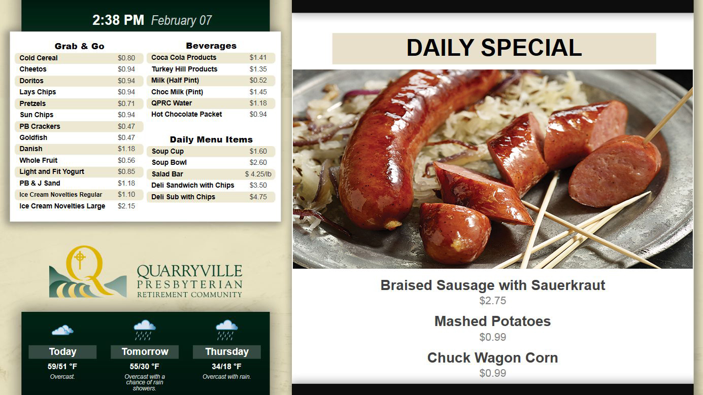 Quarryville Prebyterian came to us looking for digital signage solutions for their public eating facilities within the facility. Looking to promote their Cafe and Bistro’s seasonal, weekly and daily food specials, QPRC asked for a system to help showcase a variety of dietary options available for purchase. QPRC sought to have a system that was easy to update and maintain. They requested to be able to feature holiday announcements or special events within the facility.