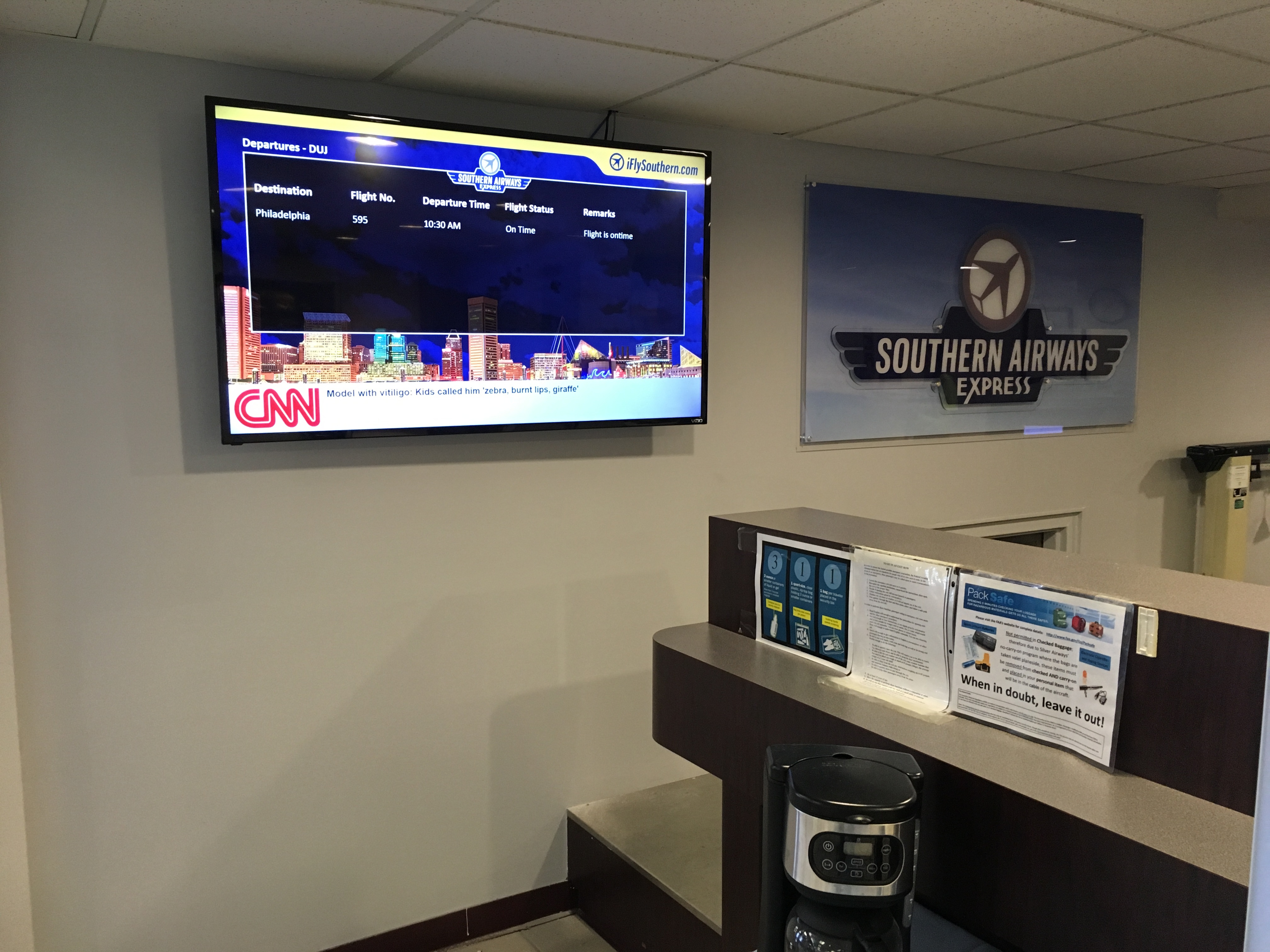 Southern Airways Express brought their vision to ConnectedSign. They were looking for a cost-effective, easy to manage digital signage solution that allowed multiple templates to be displayed in multiple airports. Each regional airport needed to have its own unique set of data, detailing flight arrivals, departures, and weather conditions. Data accuracy was important; consistent and timely updates of flight status. SAE also wanted to make “on the spot” updates.