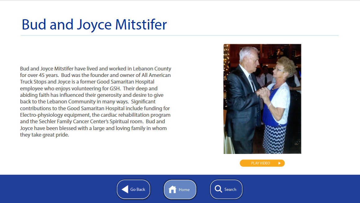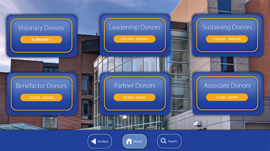 Working closely with the marketing team and designers at Good Samaritan Hospital, ConnectedSign created the behind the scenes infrastructure; that is, the interface. Multiple layers of advanced live data were created to display donors and their information using advanced interactivity and play trigger techniques. The signage displays live data, videos, images, and PDF documents with ease, each placed in their own unique category and sorted neatly.