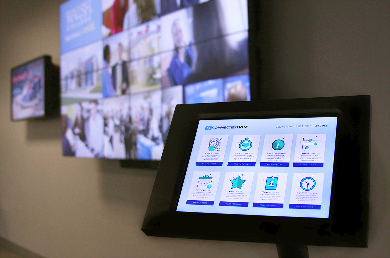 - Businesses and corporations. Getting back to business as usual has been difficult since the pandemic started. Touch screens in offices help tip the scales in lowering the risk to employees and visitors. Things like wayfinding for visitors and checking in and out of work for employees can be handled through touch screens in a contact-less way.