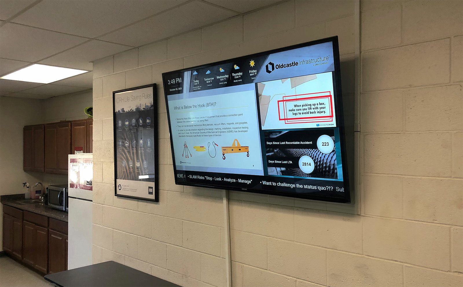 Engage employees with training videos and other safety procedures on digital signage displays in breaks rooms and other locations workers congregate. Interactive touchscreens and kiosks can be used by employees to review training, HR, and other corporate literature regularly.