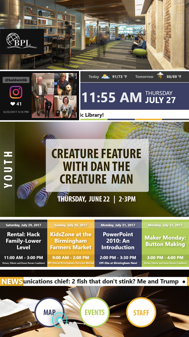 Manage your entire digital communications network from a single platform that supports static, dynamic and interactive content. Display campus events, wayfinding, city points of interest, transportation, restaurants, and other information such as news, weather, emergency messaging and social media posts.