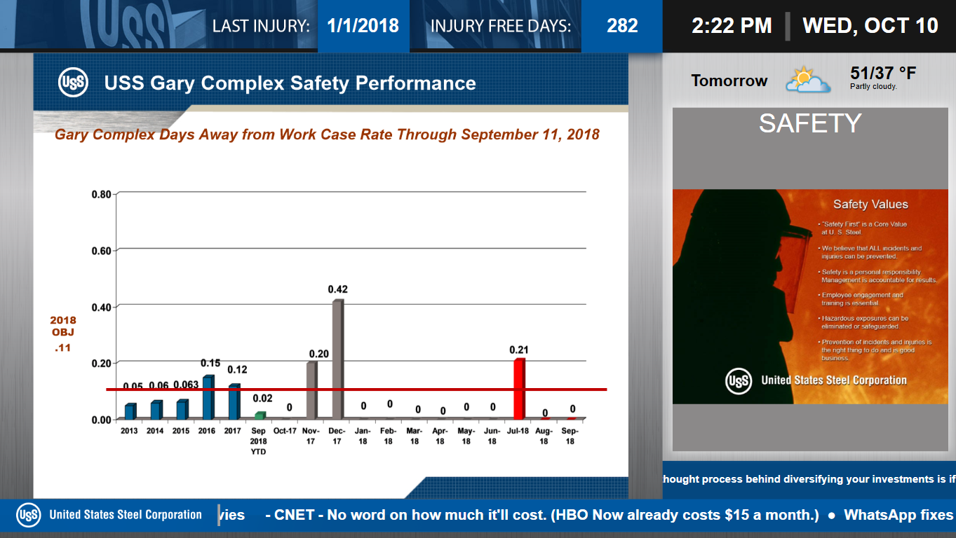 Announce safety protocols. Safety is important in all companies, but manufacturing facilities tend to pose more danger than other industries. Reminders about safety, countdowns of the number of days worked without an accident, and announcements about new required PPE or additional eye wash stations can all be conveyed through digital signage. Safety data is more likely to be absorbed this way than from an old-fashioned sign posted in the break room or hallway.